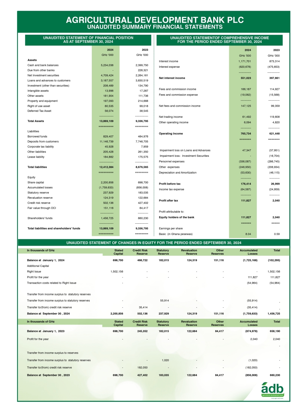 The Agricultural Development Bank PLC (ADB) has doubled its commitment to Corporate Social Responsibility (CSR) as the bank records significant gains in its unaudited statement of financial position as at September 2024.
