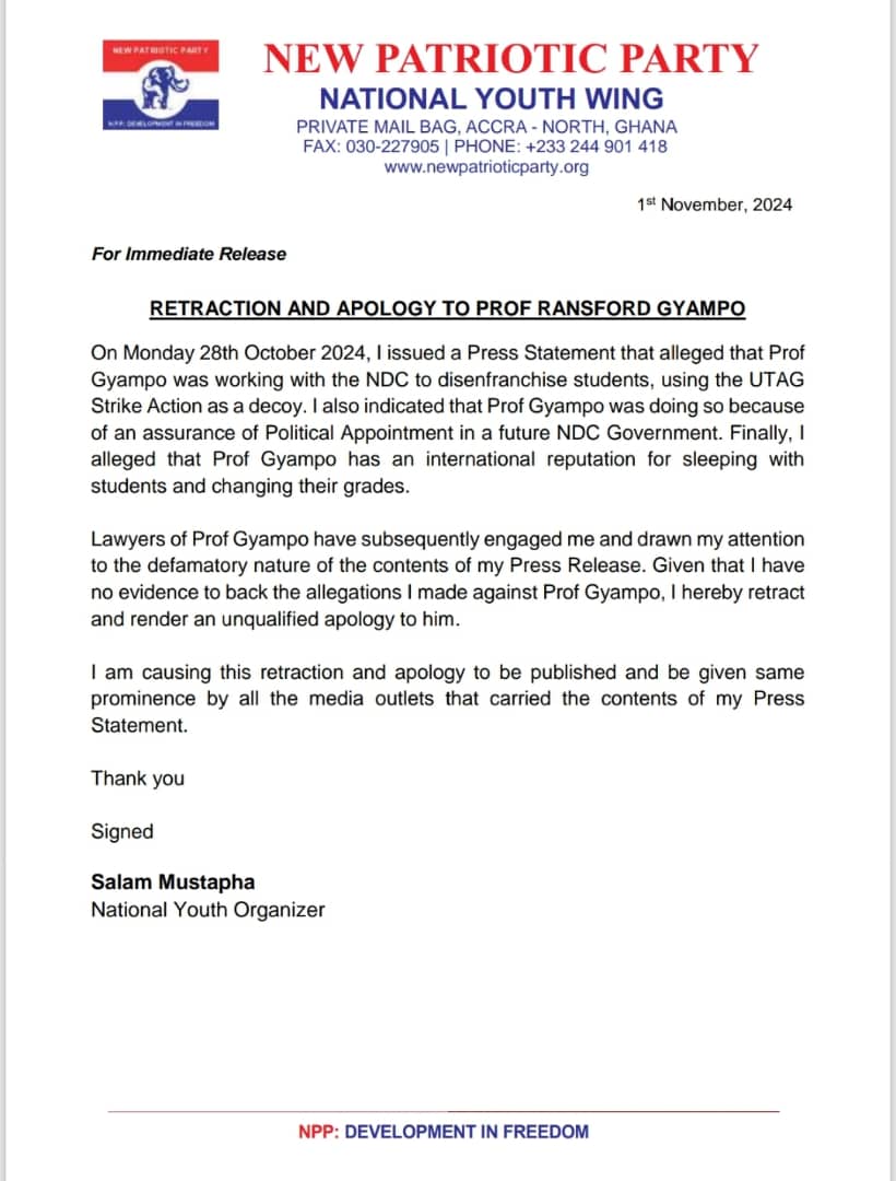 The National Youth Organizer of the governing New Patriotic Party (NPP), Salam Mustapha, has formally retracted allegations made against Prof. Ransford Gyampo of the University of Ghana.