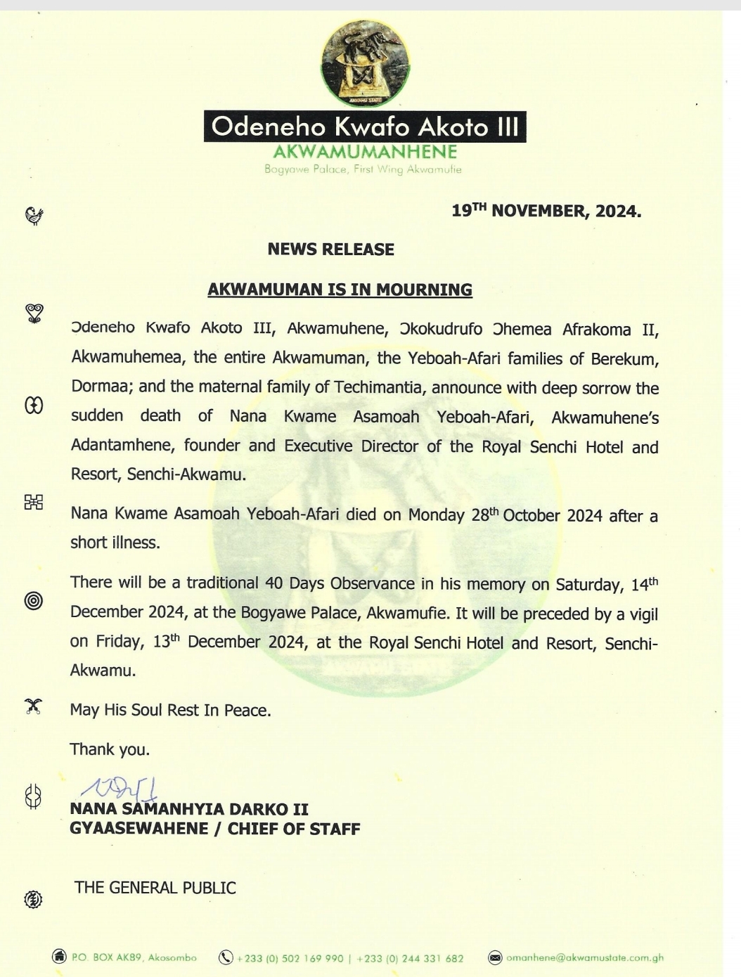 A statement issued on Tuesday, November 19, 2024 and signed by the Gyaasewahene of the Akwamu Traditional Council, Nana Samanhyia Darko II indicated, “there will be a traditional 40 days Observance” in memory of his passing on Saturday December 14, at the Bogyawe Palace, Akwamufie.