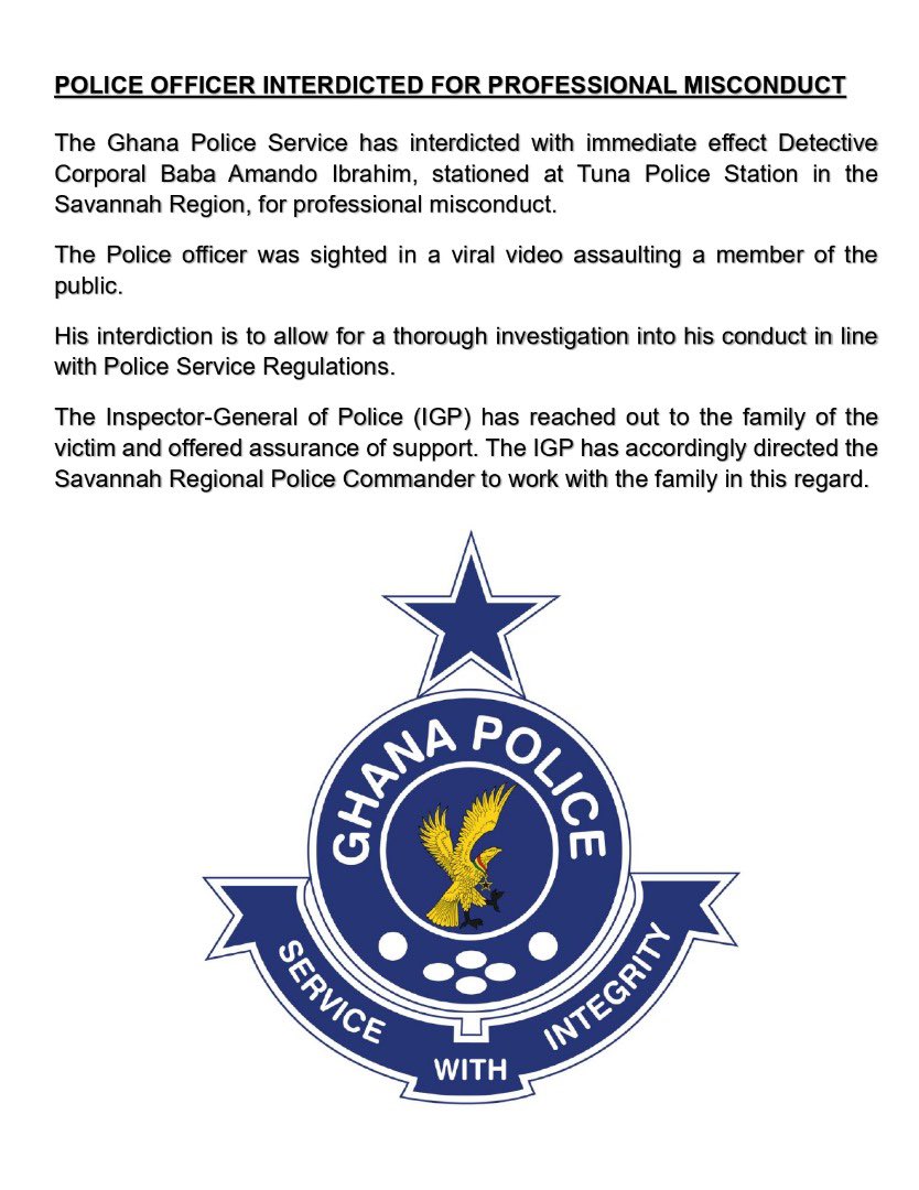 The officer, Detective Corporal Baba Amando Ibrahim, stationed at the Tuna Police Station in the Savannah Region, was cited in a viral video assaulting a member of the public.