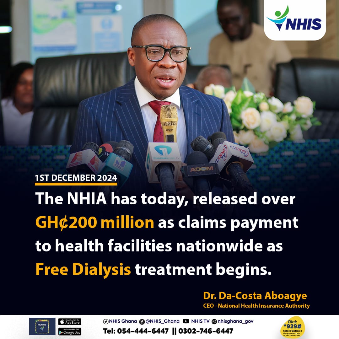 “The NHIA has today [Sunday] released over GHS200 million as claims payment to healthcare facilities nationwide as free dialysis treatment begins,” It said on Sunday, December 1, 2024.