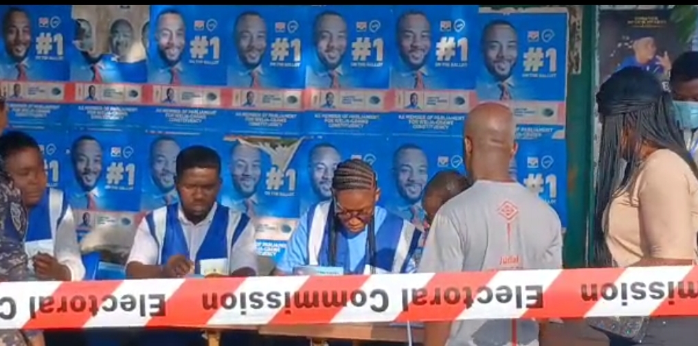 Agents of the opposition National Democratic Congress at a polling station in Gbawe in the Weija-Gbawe Constituency are unhappy the EC officials mounted their set right in front of the billboard of one of the parliamentary candidates.