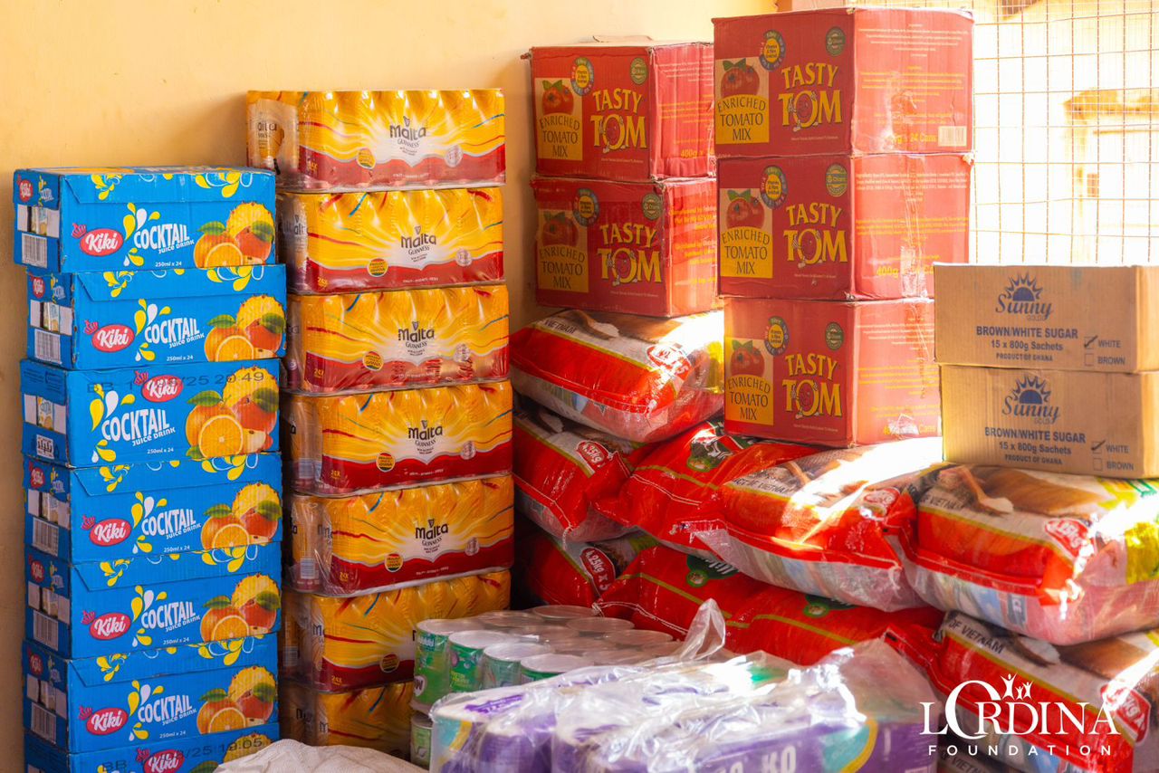 The items presented included bags of rice, cartons of cooking oil, canned tomatoes, malt drink, fruit juice, milo beverage, bottled water, Tom Brown, Gari mix, spaghetti, tissue paper, and detergents.
