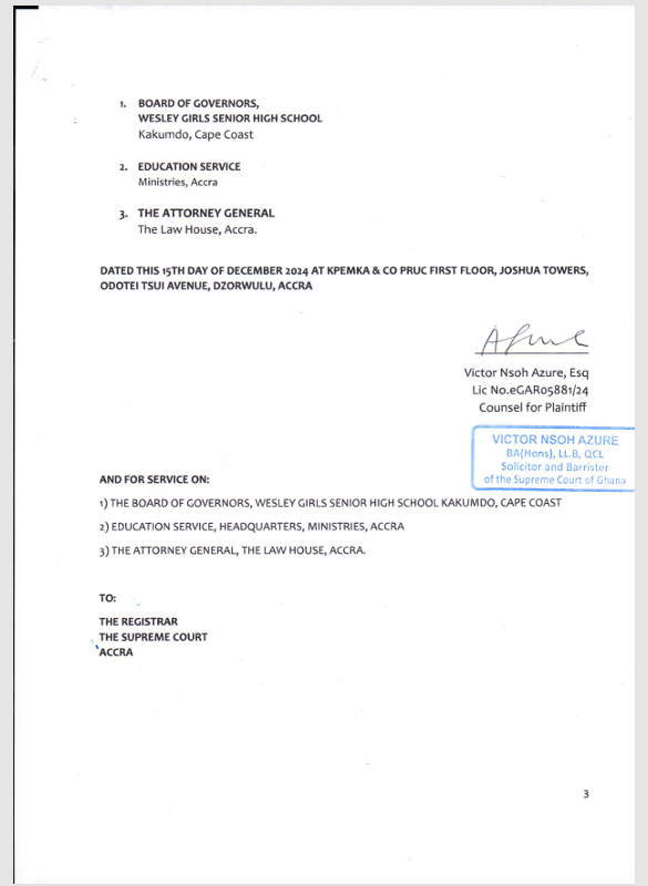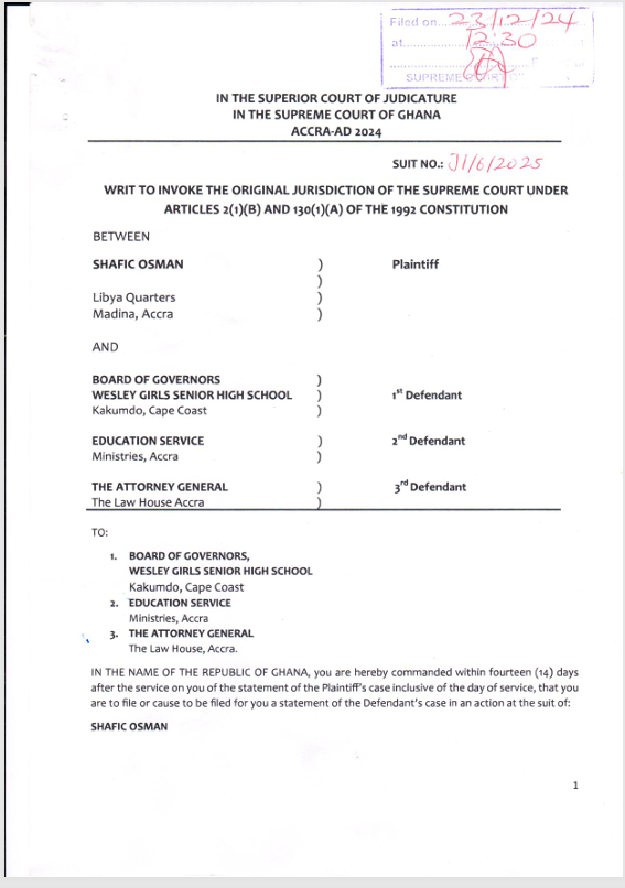 The plaintiff is also seeking an order from the Ghana Education Service to “enact constitutionally compliant guidelines for the regulation of religious practice and observance in all public schools in Ghana.”