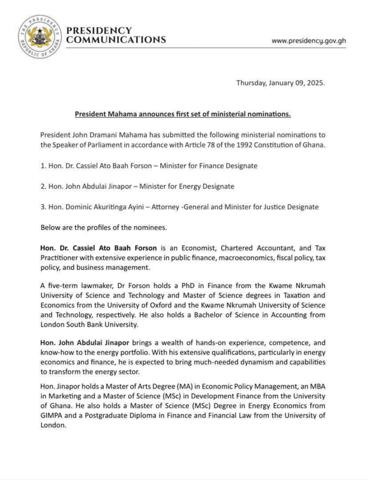 President John Dramani Mahama has announced his first set of ministerial nominations for his National Democratic Congress (NDC) led-administration