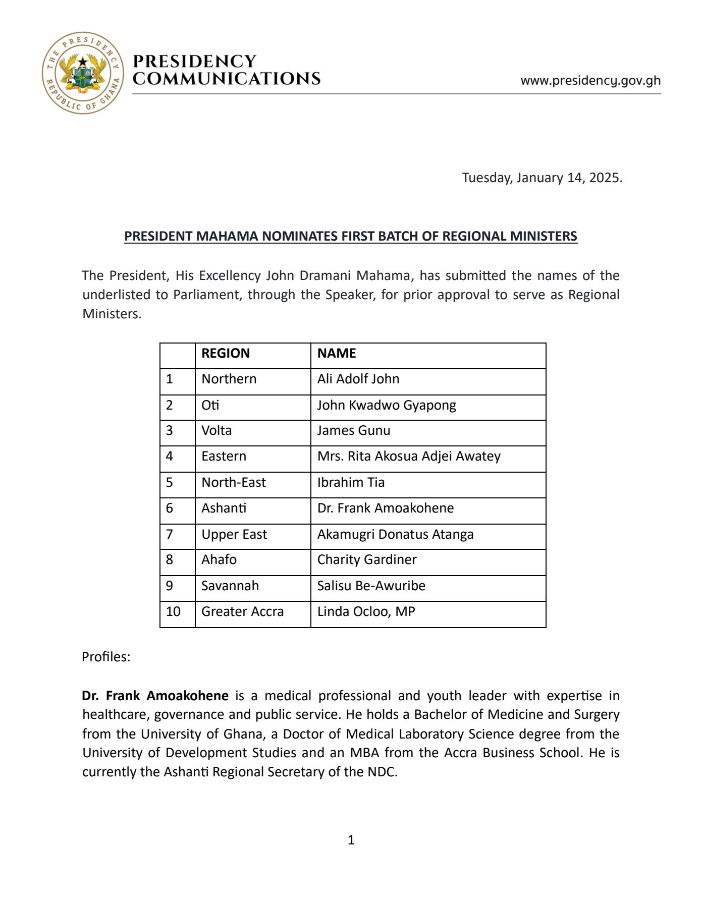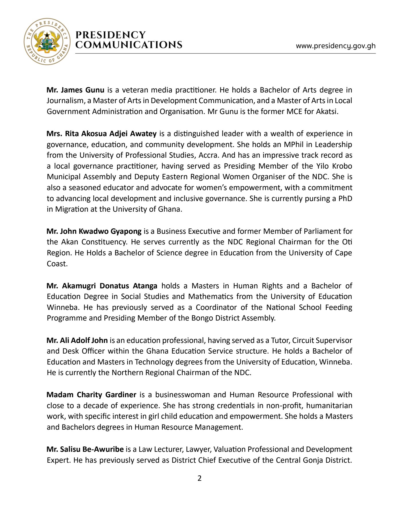 Other nominees have been selected for the Oti, Volta, Eastern, Northern, North East, Upper East, Ashanti, Ahafo, and Savannah regions.