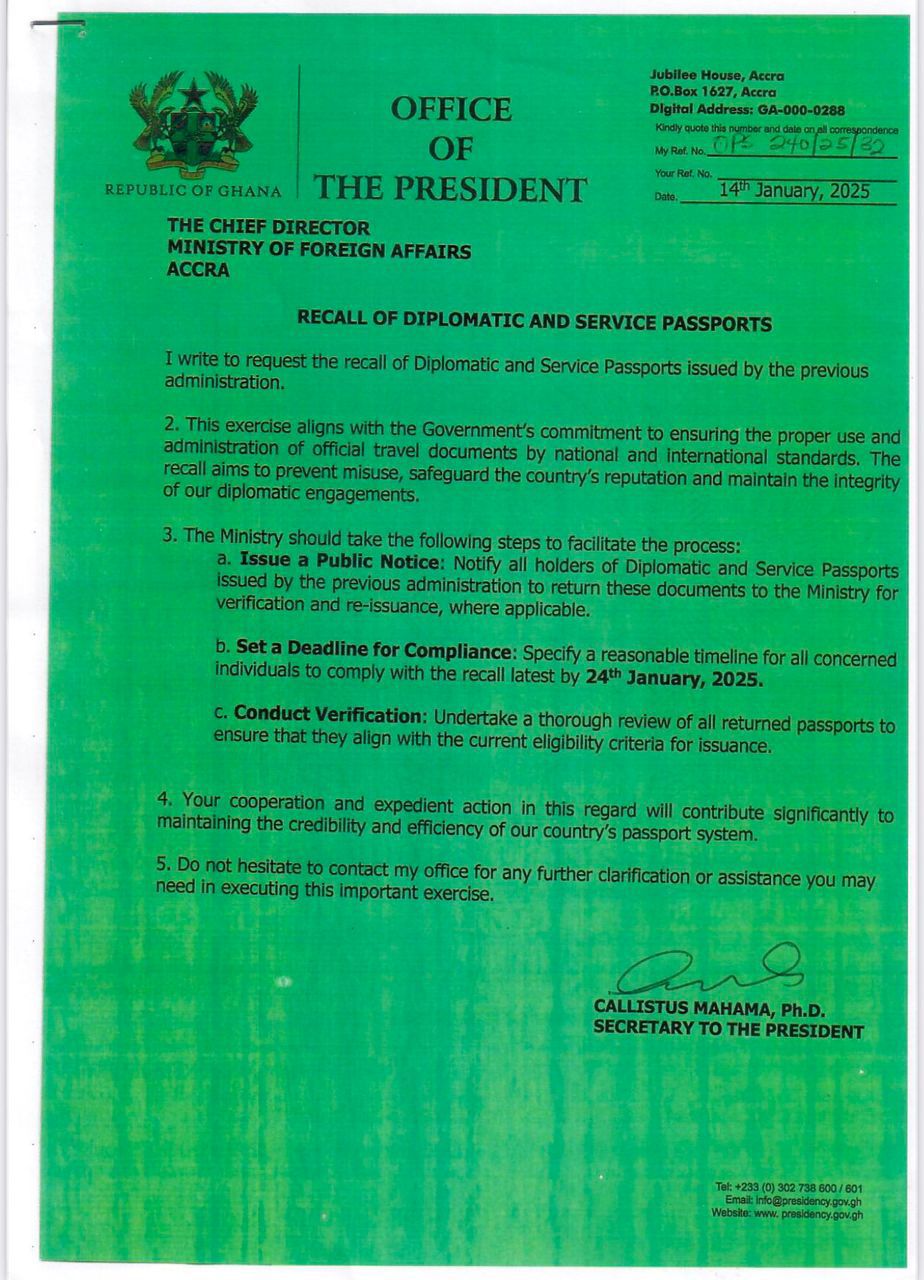 In a letter dated January 14, 2025, Presidential Secretary, Dr Callistus Mahama explained that the directives align with the government’s commitment to ensuring the proper use and administration of official travel documents in compliance with national and international standards.