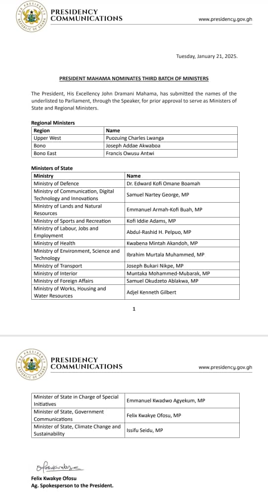 The latest set of nominees was announced in a statement issued by the presidency on Tuesday, January 21, 2025, and signed by the Acting Spokesperson to the President, Felix Kwakye Ofosu.