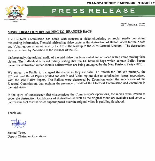 “The presence of Electoral Commission staff and Zoomlion personnel in the video is explained by the supervised destruction of the ballot papers. The original video and certificates of destruction are available as proof that the allegations are baseless and misleading,” the statement explained.