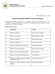 President John Dramani Mahama has submitted the names of several nominees to Parliament for prior approval to serve as Deputy Ministers in his administration. This move, made in line with Articles 78(1) and 79(1) of Ghana’s Constitution, reflects the government’s ongoing efforts to strengthen key sectors and drive national development.