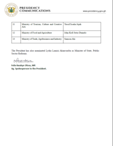 Additionally, Lydia Lamisi Akanvariba has been nominated as Minister of State in charge of Public Sector Reforms, signaling the government’s commitment to improving efficiency and accountability across public institutions.