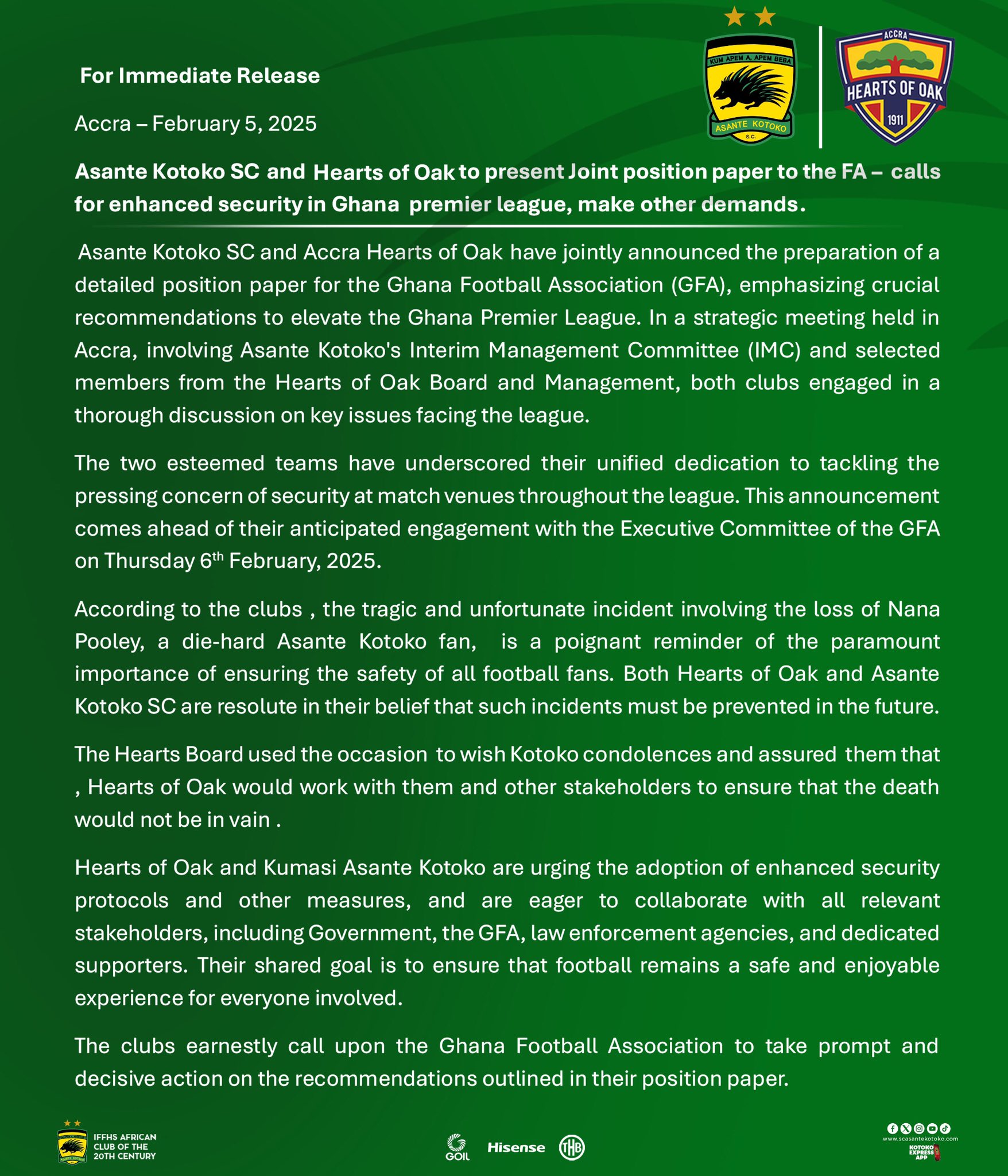 The clubs earnestly call upon the Ghana Football Association to take prompt and decisive action on the recommendations outlined in the statement.