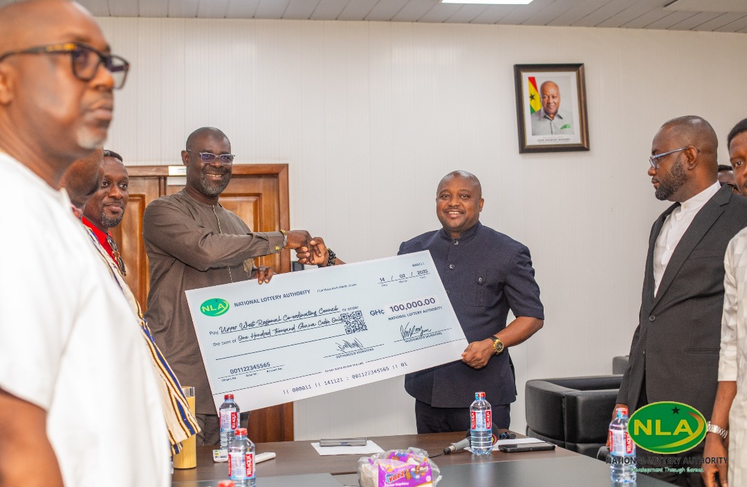 The cheque was presented by the Director General of the NLA, Mohammed Abdul Salam to the Upper West Regional Minister, Charles Lwanga Puozuing.