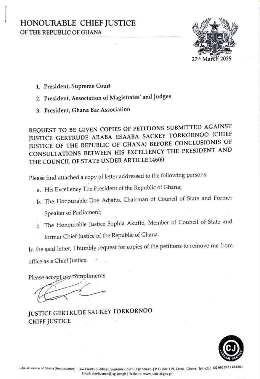 In her letter, Justice Torkornoo formally requested access to the petitions filed against her, reaffirming her commitment to due process and transparency in the administration of justice.