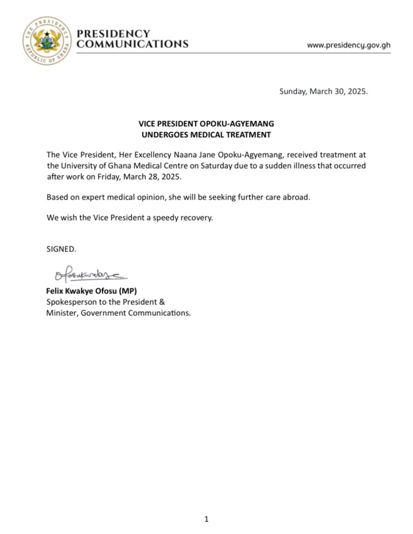 According to Presidential Spokesperson, Felix Kwakye Ofosu, Prof. Opoku-Agyemang initially received care from doctors at the University of Ghana Medical Centre on Friday, March 28, 2025, after she took ill suddenly after work same day.