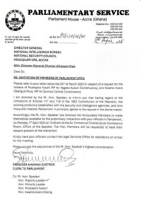 The meeting is set to take place at the Sir Emmanuel Charles Quist Conference Room, Office of the Speaker. The MPs have also been advised to have their legal representatives present at the meeting.