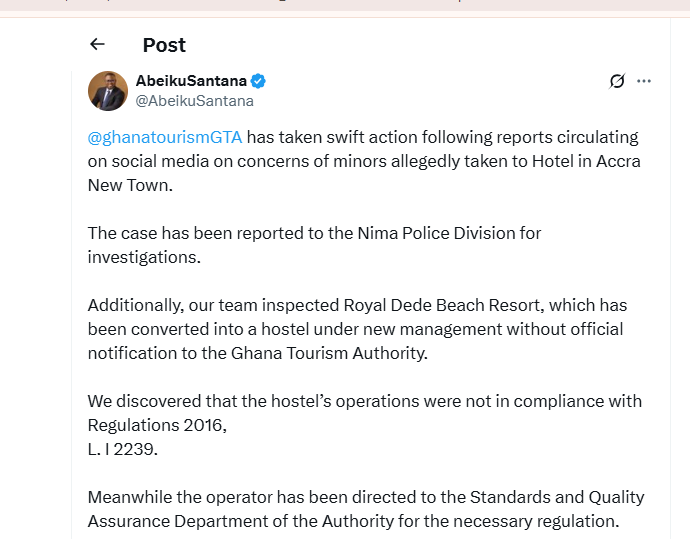 The Deputy Executive Officer of the Ghana Tourism Authority (GTA), Abeiku Santana, has responded to a widespread video in which a woman accuses Royal Dede Beach Resort of allowing minors to engage in intimate activities on the premises.