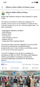 In a Facebook post, the Pilgrims Affairs Office of Ghana said the team has been deployed to Saudi Arabia to finalize preparations for the upcoming pilgrimage.