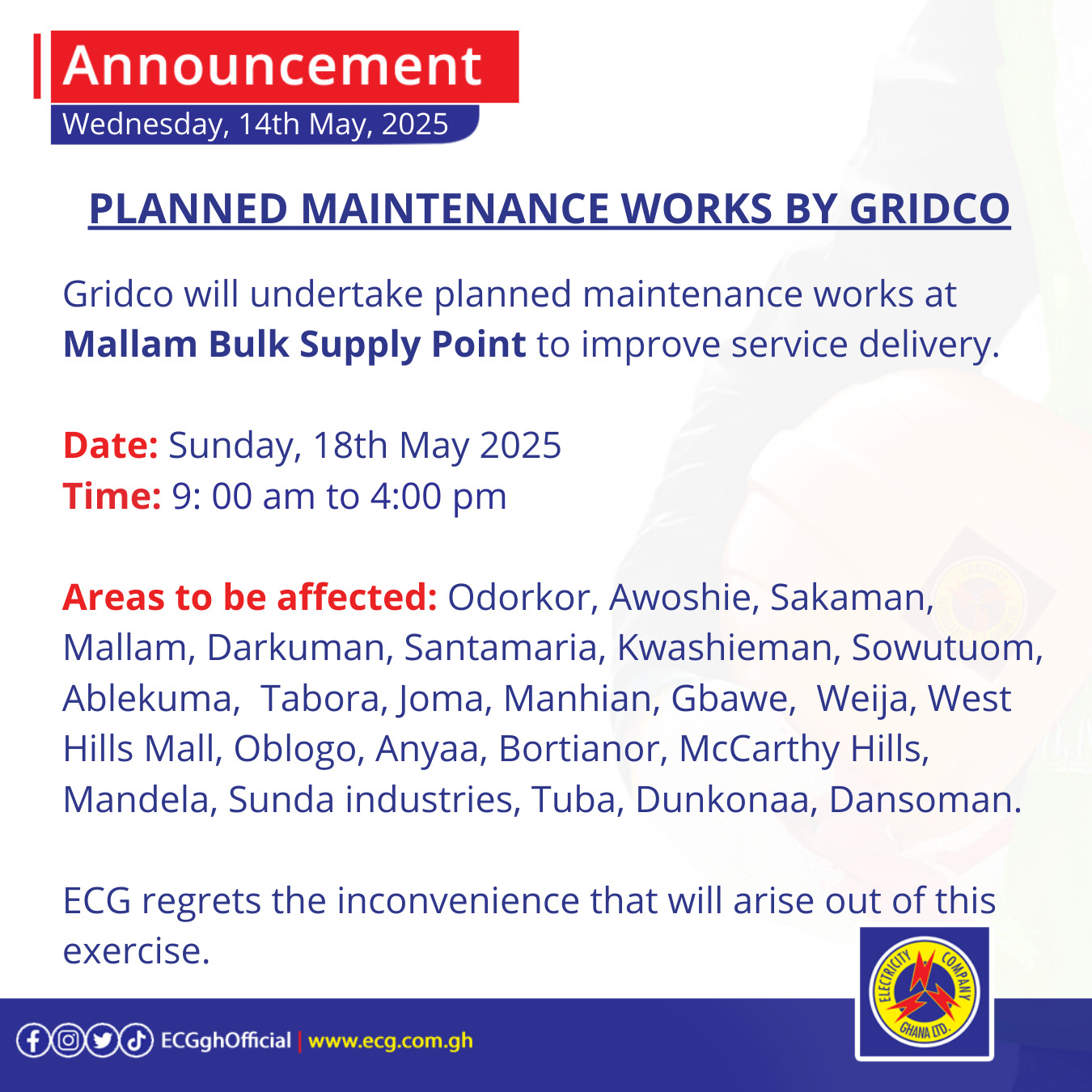 In a notice dated Wednesday, May 14, 2025, the Electricity Company of Ghana (ECG) explained that the planned maintenance is aimed at improving service delivery.