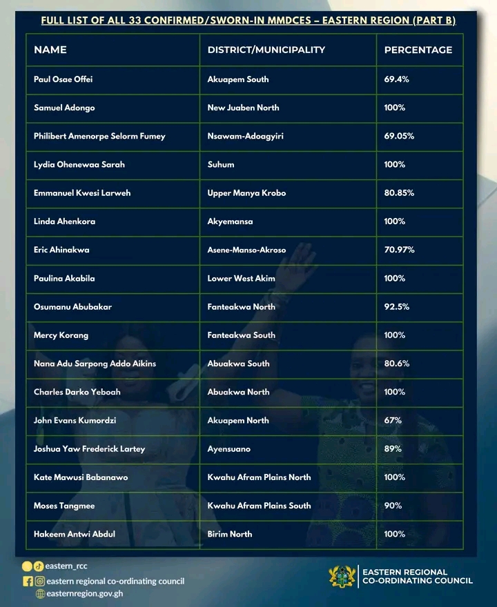 Angelonline.com.gh presents confirmed list of all 33 of President’s nominees for position of Municipal and District Chief Executives (MDCEs) in Eastern Region.