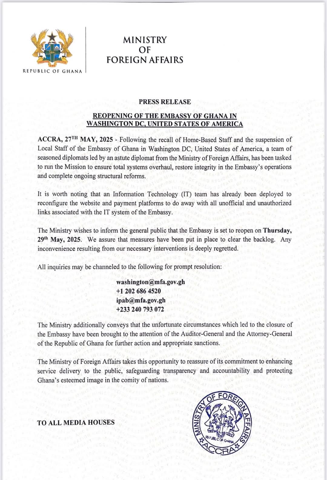 The Ministry of Foreign Affairs has announced that Ghana’s Embassy in Washington DC will officially reopen on Thursday, May 29, 2025, after a period of closure due to internal restructuring and reforms.