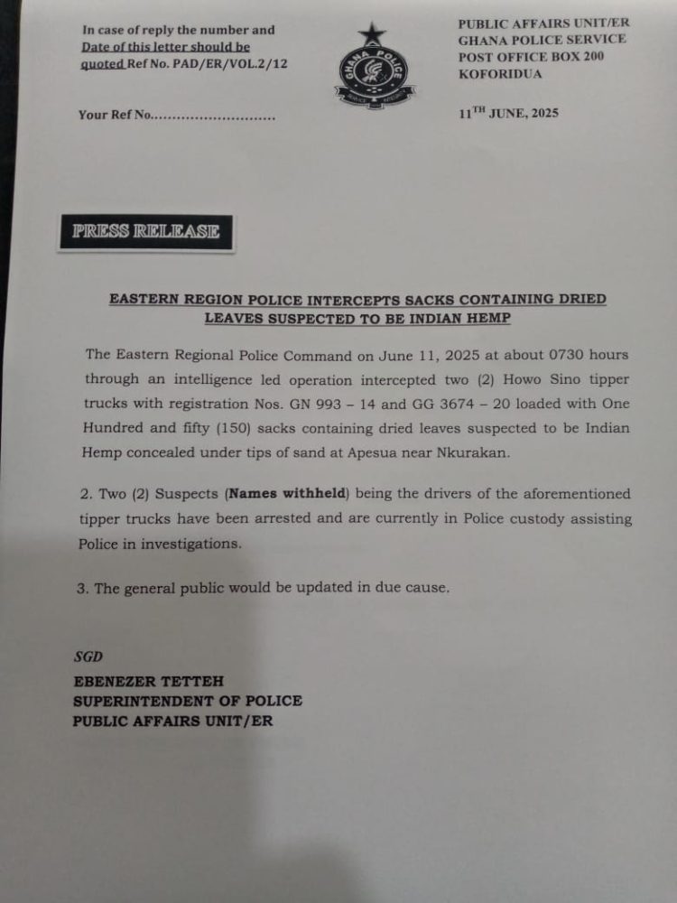 In a police statement signed by Superintendent Ebenezer Tetteh of the Public Affairs Unit of the Police Command confirmed the interception of the two Howo Sino Tipper Trucks with registration numbers GN 993-14 and GG 3674-20 loaded with the substances under the tips of sands.