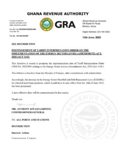 The Ghana Revenue Authority (GRA) has announced a postponement of the implementation of Tariff Interpretation Order (TIO) No. 2025/004, pertaining to the Energy Sector Levies (Amendment) Act, 2025 (Act 1141).