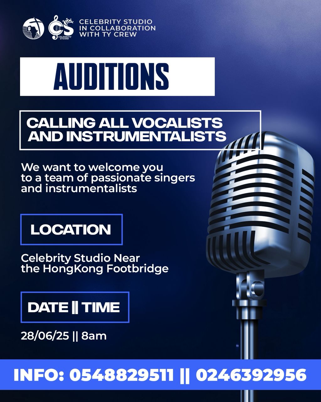 The auditions will take place at Celebrity Studio, located near the Hong Kong Footbridge, Accra, on Saturday, June 28, 2025, at 8 am.