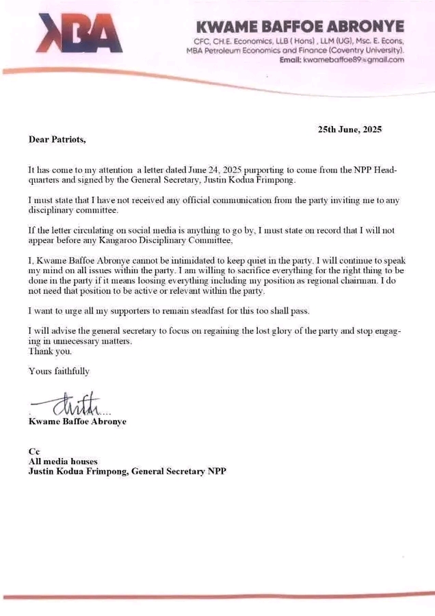 “I, Kwame Baffoe Abronye, cannot be intimidated to keep quiet in the party,” he said in a statement dated Wednesday, June 25, 2025.