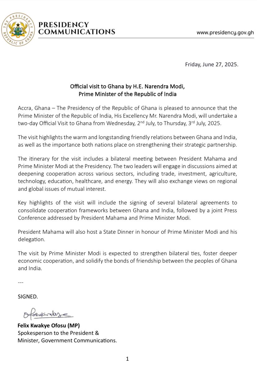 The Prime Minister of the Republic of India, Narendra Modi, will embark on a two-day official visit to Ghana from Wednesday, July 2, to Thursday, July 3, 2025, the Office of the President has announced.