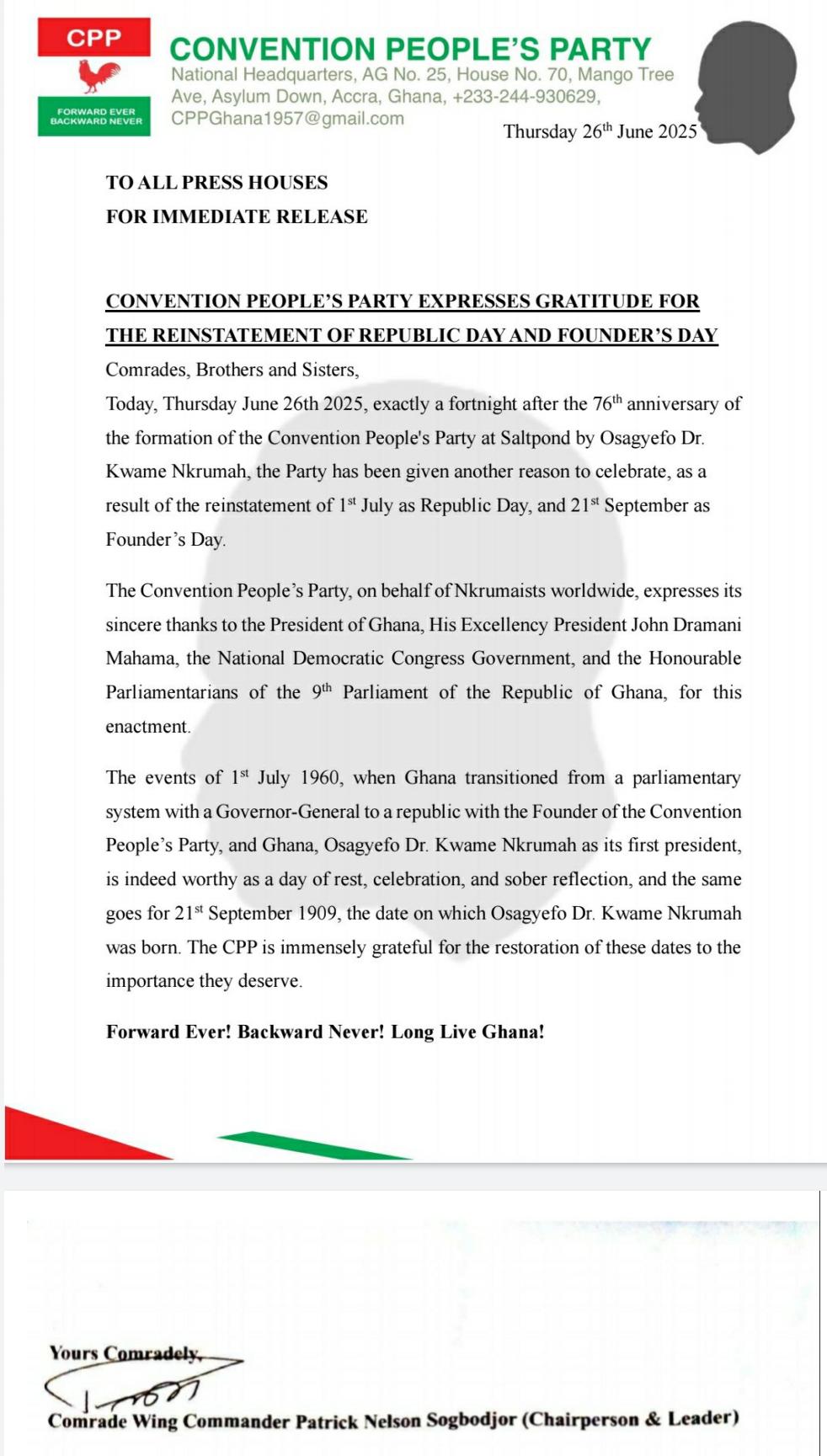 “The Convention People’s Party, on behalf of Nkrumaists worldwide, expresses its sincere thanks to the President of Ghana, His Excellency President John Dramani Mahama, the National Democratic Congress Government, and the Honourable Parliamentarians of the 9th Parliament of the Republic of Ghana, for this enactment,” it said.