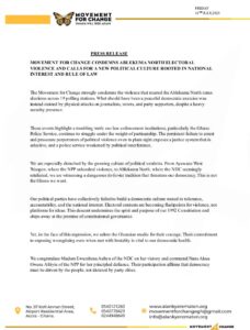 Movement for Change in a statement condemned the persistent failure to arrest and prosecute perpetrators of political violence, even when such acts occur in plain sight.