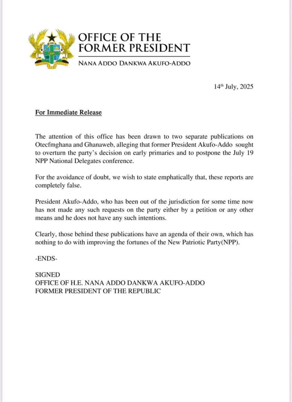 Former President Nana Addo Dankwa Akufo-Addo has categorically dismissed reports alleging that he is behind efforts to postpone the New Patriotic Party’s upcoming National Delegates Conference, slated for July 19, 2025.
