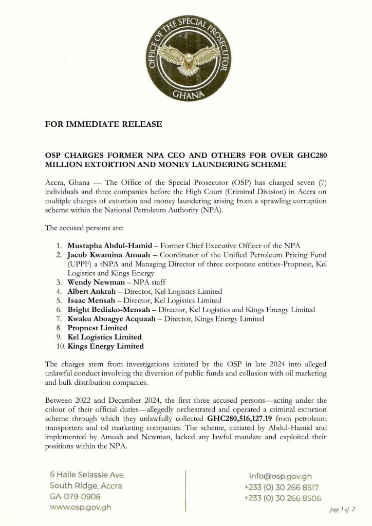 The Office of the Special Prosecutor (OSP) has charged seven (7) individuals and three companies before the High Court (Criminal Division) in Accra on multiple charges of extortion and money laundering.
