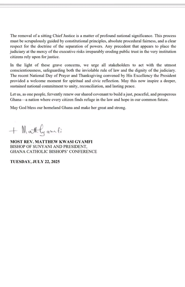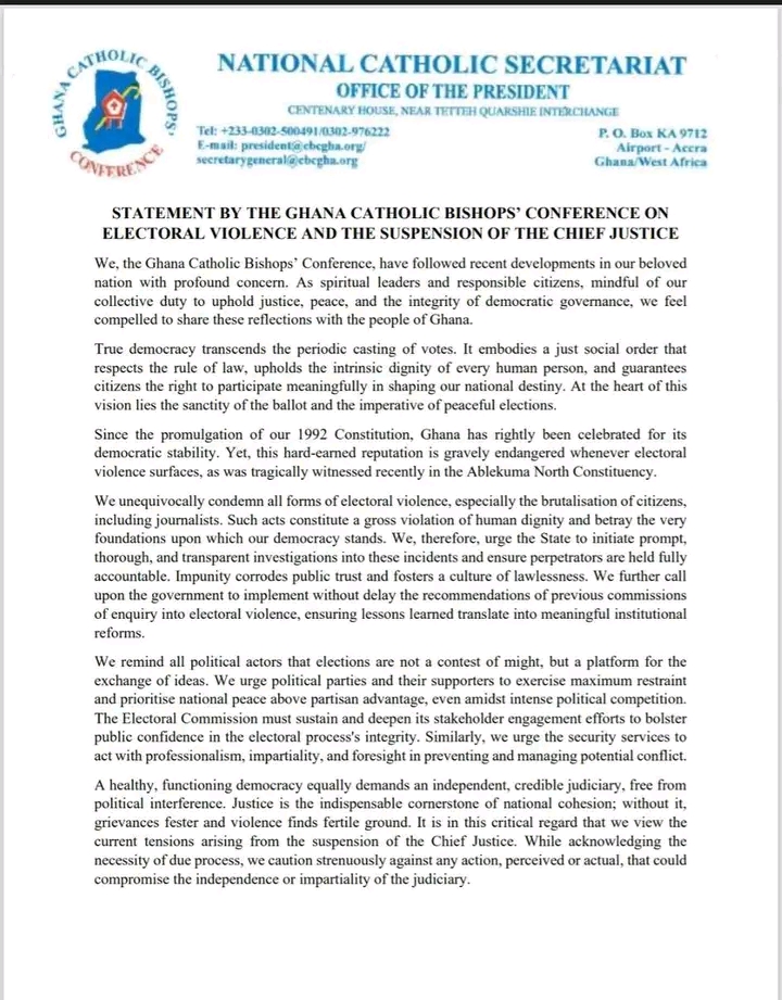 Amid the suspension of Chief Justice, the Ghana Catholic Bishops Conference has issued a strong caution against any moves that might undermine the credibility and autonomy of the judiciary.