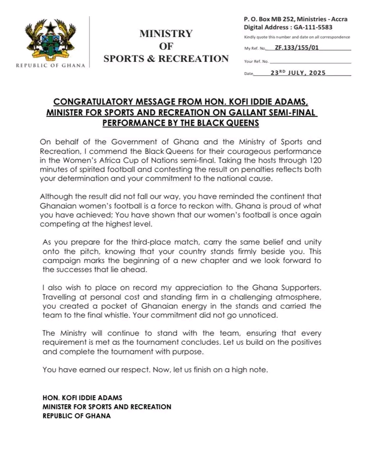 Though the Queens did not advance to the final, the Ministry underscored their achievement as a bold reminder that Ghana remains a formidable force in African women’s football.