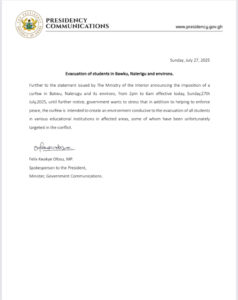The government has imposed a new curfew in Bawku, Nalerugu, and surrounding areas from 2:00 p.m. to 6:00 a.m., effective today, Sunday, July 27, 2025, until further notice.