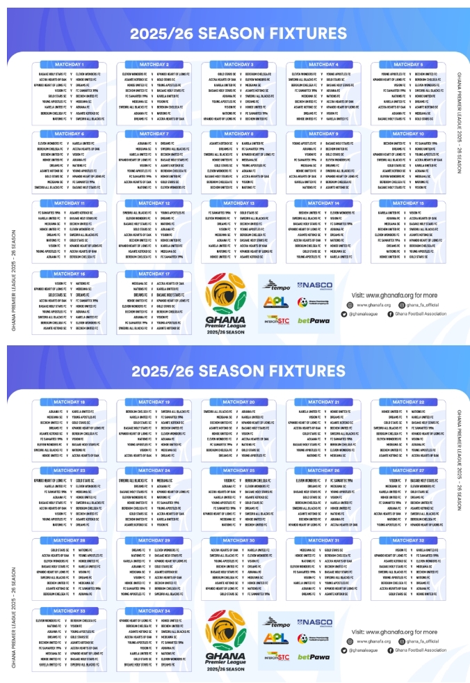 The Ghana Football Association (GFA) has unveiled the full fixture list for the 2025/26 Premier League season, offering fans and clubs a first look at the highly anticipated match-ups that will shape the new campaign.