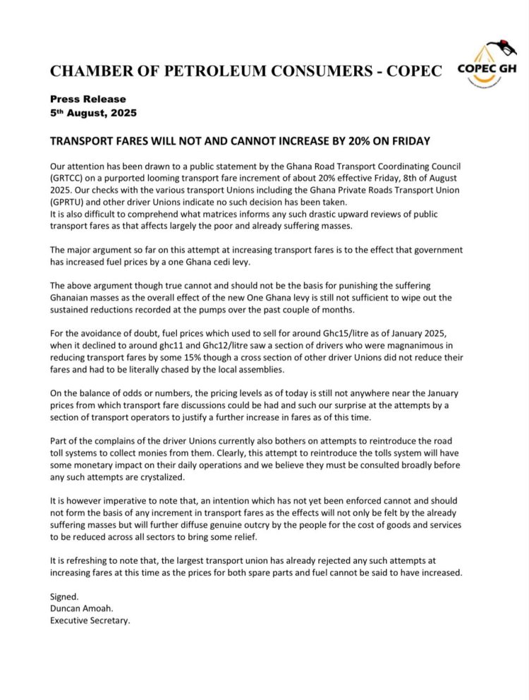 The Chamber of Petroleum Consumers (COPEC) has rejected a proposed 20% increment in transport fares announced by the Ghana Road Transport Coordinating Council (GRTCC), scheduled to take effect on Friday, August 8, 2025.