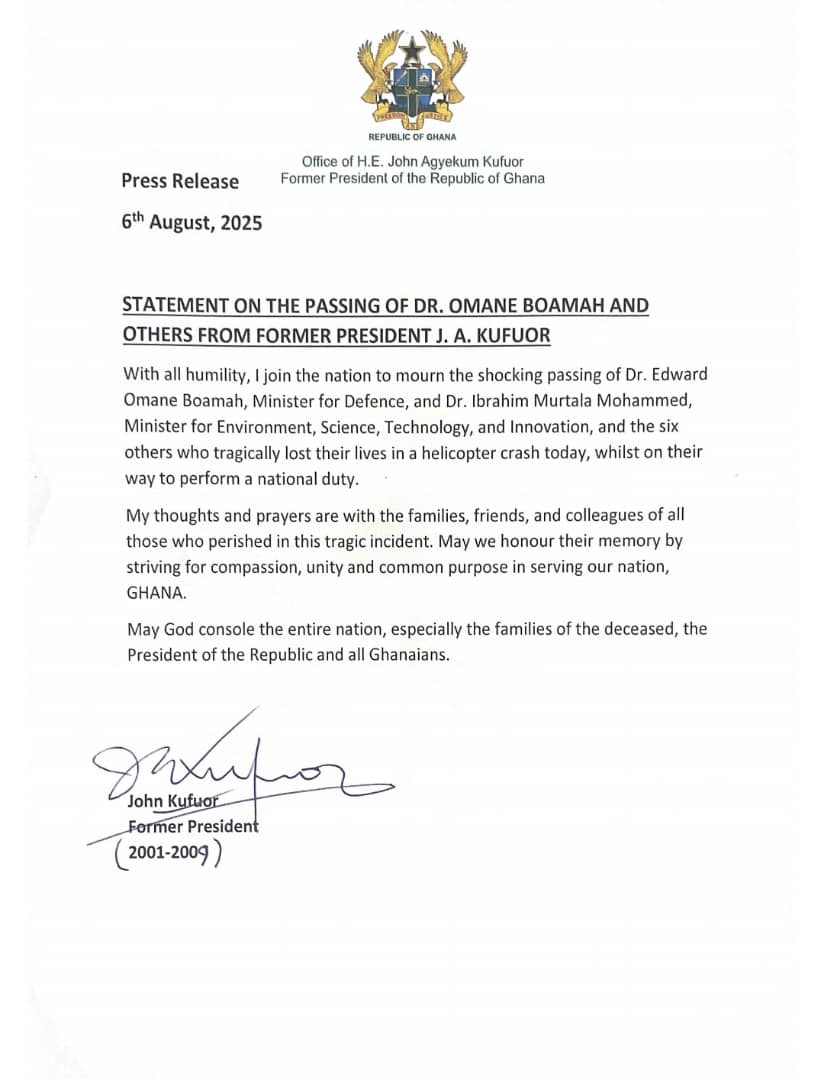 Mr. Kufuor conveyed deep sorrow over the loss of Dr. Edward Omane Boamah, Minister for Defence, and Dr. Ibrahim Murtala Mohammed, Minister for Environment, Science, Technology, and Innovation, along with six others perished while undertaking national duty.