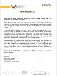The Movement for Change has extended its deepest condolences to His Majesty Otumfuo Osei Tutu Ababio I, the Royal Family, and the people of Asanteman on the passing of the Asantehemaa, Nana Konadu Yiadom I.