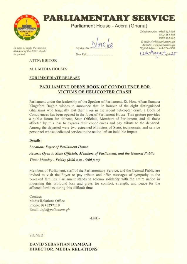 The initiative, led by Speaker Rt. Hon. Alban Sumana Kingsford Bagbin offers a space for citizens, officials, and Members of Parliament to express their sympathies and pay tribute to the departed.
