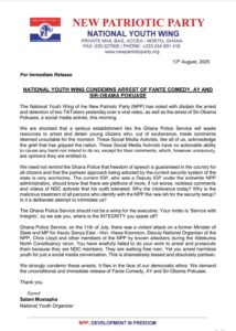 The National Youth Wing of the New Patriotic Party (NPP) has expressed profound dismay regarding the arrest and detention of two TikTokers on Tuesday, August 12, 2025, alongside the apprehension of Sir-Obama Pokuase, a noted social media activist.
