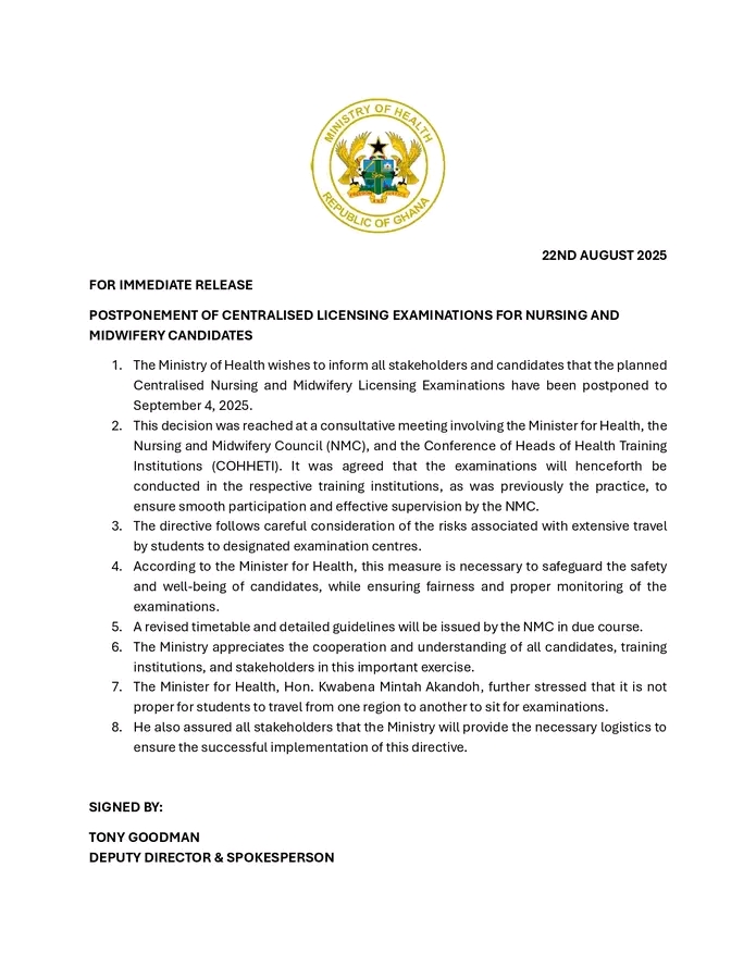 The Ministry of Health has announced the postponement of the Centralised Licensing Examinations for nursing and midwifery candidates, originally scheduled for August.