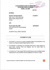 The assaulted Ghanaian nurse at Ridge Hospital, Rejoice Tsotsoo Bortei, has initiated legal action against social media activist Ralph Saint Williams, filing an issue of writ.
