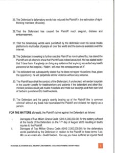 “Damages of Two Million Ghana Cedis (GHS 2,000,000.00) for the defamatory statements published by the defendant regarding the plaintiff, specifically the words: “Liar, Wo se wo nsam abu. Duab0 bebam. You say you have suffered an injured hand.”