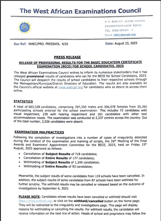 The West African Examinations Council (WAEC) has released the provisional results of candidates who sat for the 2025 Basic Education Certificate Examination (BECE) for School Candidates.