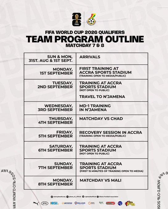 The Ghana Football Association (GFA) has unveiled the official team program for the Black Stars ahead of their upcoming FIFA World Cup 2026 qualifying matches against Chad and Mali, scheduled for early September.