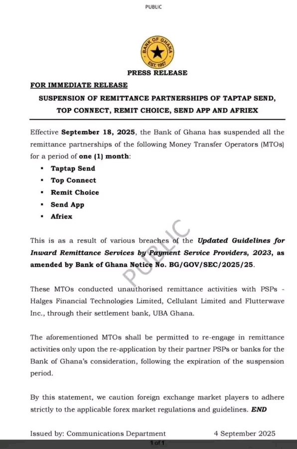 The Bank of Ghana has announced the suspension of remittance partnerships involving five Money Transfer Operators (MTOs) for a period of one month, effective 18 September 2025.