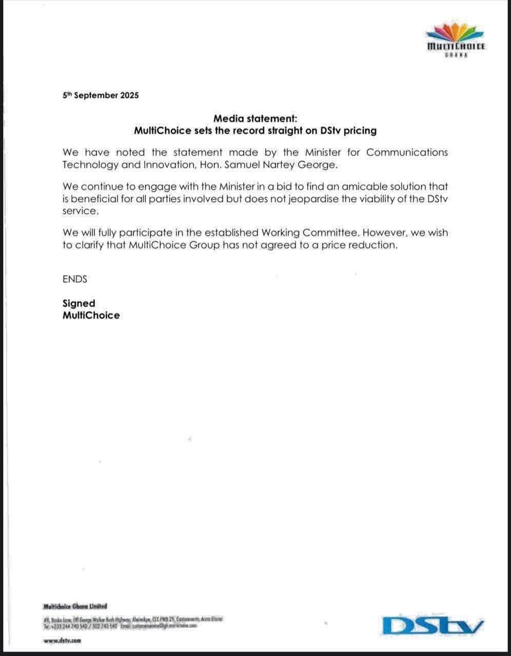 The company’s response follows an announcement by the Minister for Communications, Digital Technology, and Innovations, Samuel Nartey George, who stated that MultiChoice had agreed to cut prices.